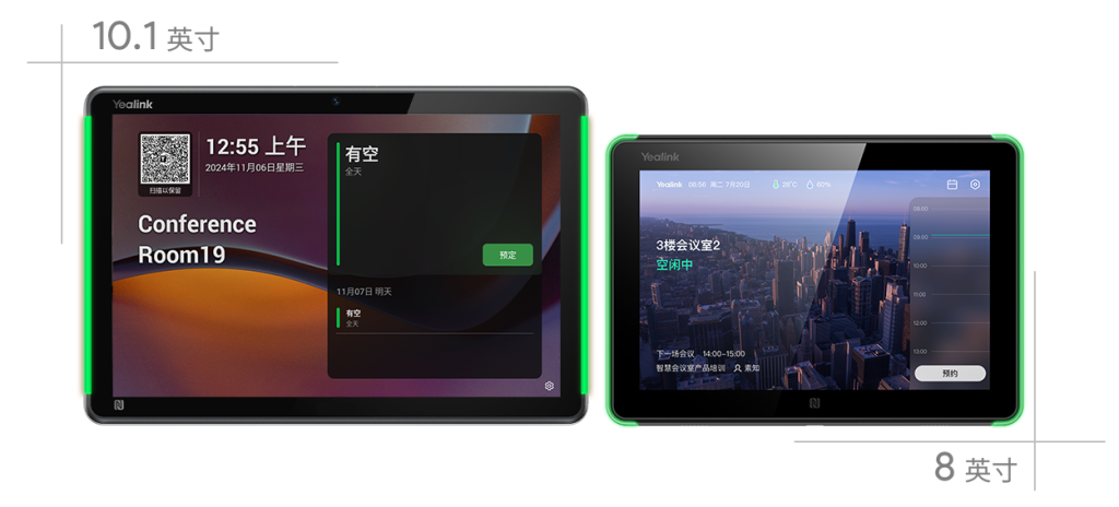 新一代 RoomPanel Plus选用 10.1 英寸的更大触控屏幕,搭载更强大的 Android 11 系统,带来更智能化的会议室管理体验。两侧全彩 LED 灯带,可清晰、 全向示意会议室的实时状态,助您轻松应对会议室日程变化。此外,更轻薄的机身设计可完美融入不同类型的会议室场景,呈现出智慧会议室的科技美学。